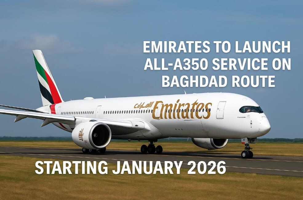 Emirates Airline will transition all flights between Dubai (DXB) and Baghdad (BGW) to the Airbus A350 beginning January 1, 2026, marking a significant upgrade to one of its most strategically important regional routes. The shift replaces a mixed-fleet operation with a fully standardized aircraft type, aiming to deliver greater comfort, reliability, and service consistency as demand for premium travel to Iraq increases.