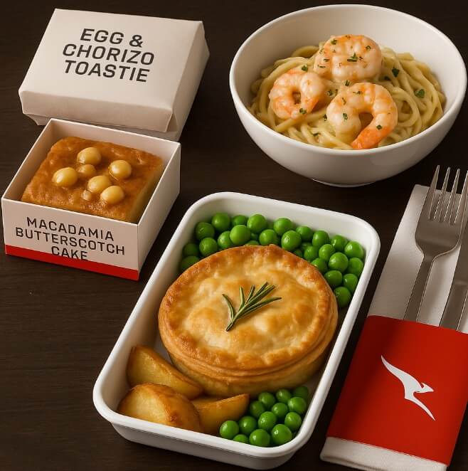 In economy class, passengers can expect dishes such as an egg & chorizo toastie with smoky tomato chutney and a macadamia butterscotch cake. Business-class travelers, meanwhile, will see elevated fare including garlic prawns with parmesan cream and fettuccine, or a lamb & rosemary pie served with crisp potatoes and peas.